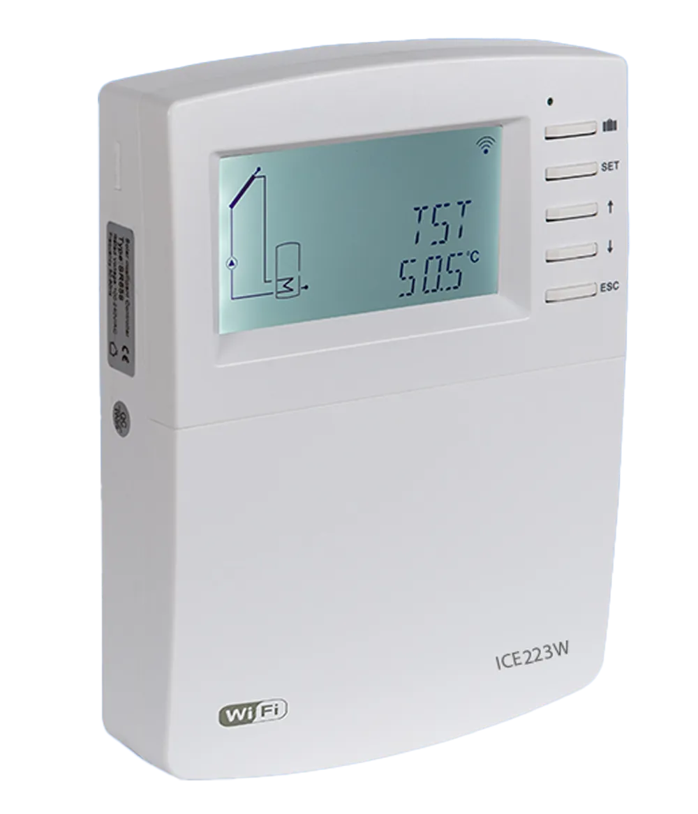 The ICE223W is an advanced controller for solar thermal, hydronic heating, and boiler systems. Featuring a large LCD display, versatile input/output options, and mobile app control, it offers precise control and monitoring for efficient energy management.
